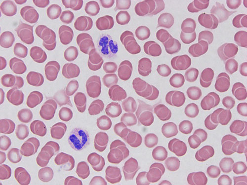 涂片:紅細胞呈橘紅色圓盤狀、無細胞核;白細胞胞核呈紫紅色,染色質清楚,粗細松緊可辨;血小板為不規則細胞質小塊、周邊均勻呈淺藍色,中央為細小的紫紅色顆粒;中性粒細胞胞核呈紫藍色,顆粒呈淺紅色,形態多樣;嗜酸粒細胞胞核呈紫藍色,顆粒呈橘紅色;嗜堿粒細胞胞核呈紫藍色;淋巴細胞胞核呈藍灰色,胞質呈淡藍色;單核細胞胞核呈紫藍色,胞質呈灰藍色。