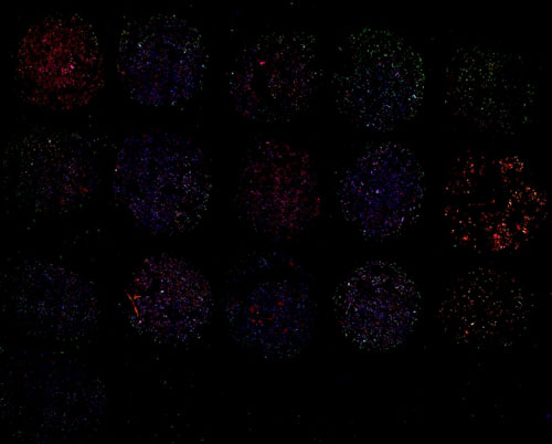 組織芯片免疫熒光染色,是將許多不同處理的組織以規(guī)則的微陣列方式排列于同一載體上,同時(shí)進(jìn)行相同指標(biāo)的免疫熒光檢測(cè)。