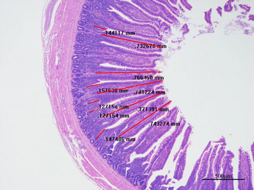 □小腸絨毛高度;□小腸絨毛寬度;□小腸隱窩深度;□單位面積內隱窩數量;□大腸腸腺深度;□腸粘膜層厚度;□腸肌層厚度。