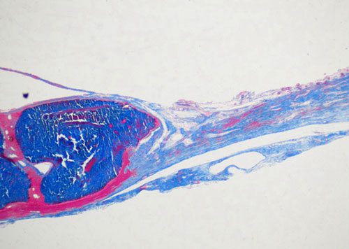 Masson染色,常用于區分膠原纖維和肌纖維,染色原理與陰離子染料分子的大小和組織的滲透有關。未脫鈣骨組織切片經Masson染色后,膠原纖維呈藍色,肌纖維及胞質呈紅色。