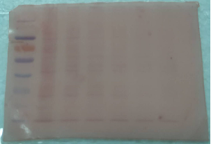 5)傾去轉膜緩沖液,拆除轉膜裝置,將硝酸纖維膜放入麗春紅中搖床染色15min,用去離子水清洗至能看到條帶,后用鉛筆標出marker位置,再用去離子水震蕩以去除浮色。在右上角剪去一角以辨上下左右;