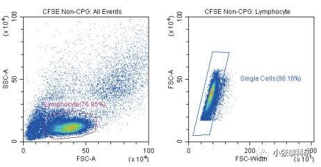 7、取部分細(xì)胞作為不染色組陰性對(duì)照,其他細(xì)胞加入CFSE溶液,使得終濃度為5μM,37°C避光孵育15min;